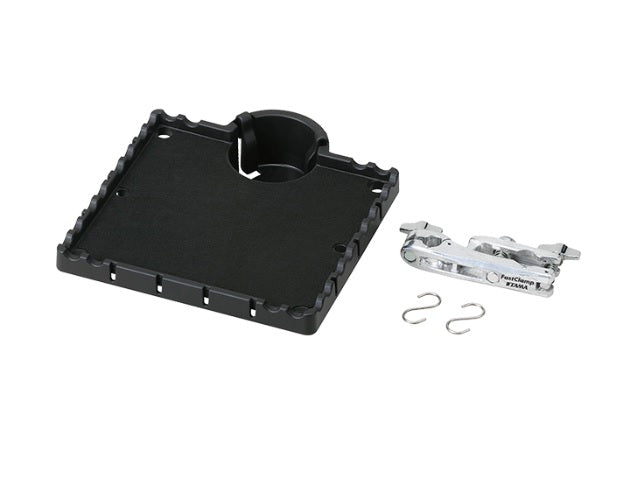 Designed to hold essential items for any performance, the TAT10 Accessory Tray includes a cup holder, unique edges specially shaped for drumsticks, and S-hooks to hang bags or other items. Covered in non-slip felt, the tray features 6 passthroughs for clean cable management. Additionally, the tray comes wth 4 poles to attach to an MC61 clamp as well as 5/8" microphone threading on the underside for even greater set-up flexibility. •Tray size (inside dimension): 235mm (9-1/4") x 254mm (10") •Drink holder: up to diameter 90mm (3-1/2") •Includes MC61 FastClamp for connecting stands with pipes from 15.9mm to 28.6mm in diameter. •Includes 2- S-Hooks for hanging bags •Rims can hold up to 16mm (0.63") diameter drum sticks •Mounted 5/8" nut for straight mic stand on bottom of the tray •Weight capacity: 2.5kg